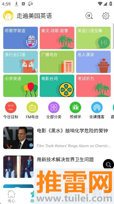 1、打开走遍美国英语app后先进入首页,点击“趣听”板块可以选择英文歌曲或广播节目,边听边看歌词和翻译,锻炼听力的同时也能熟悉地道表达方式。