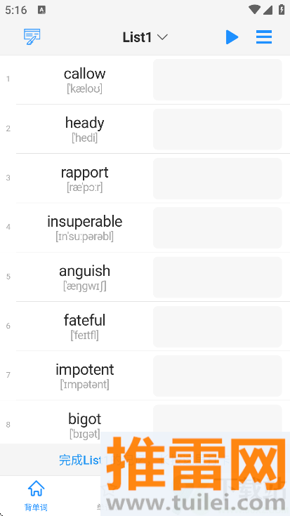 5、点右上角菜单可以进“练一练”做巩固测试,也能查词典、导出数据、建单词本,这些功能都能帮你记得更扎实。