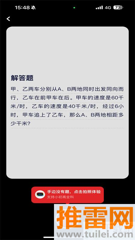 3、如果题目太长不想打字,可以点拍照答疑按钮,把题目对准框内拍清楚,等几秒就能看到解析结果,连图里的公式都能识别。