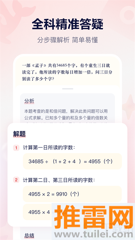 答:这款应用主要面向小学到高中阶段的学生,内容覆盖各个年级的知识点,难度会根据用户输入的题目自动匹配相应水平。