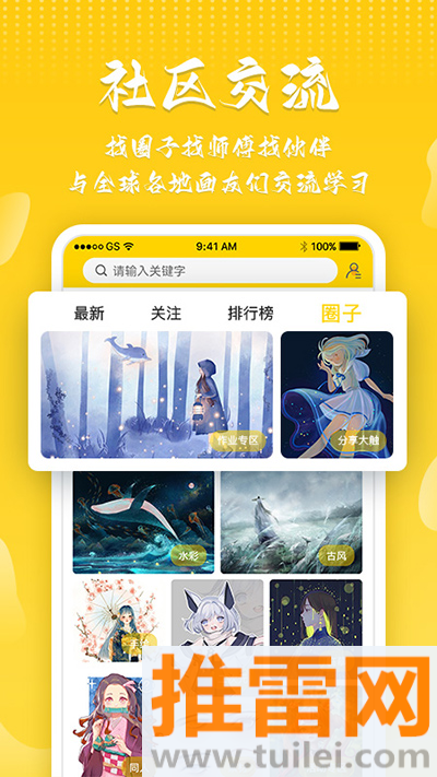 支持在社区上传绘画作品,可选择对应圈子分类并添加创作说明,一键完成分享展示。