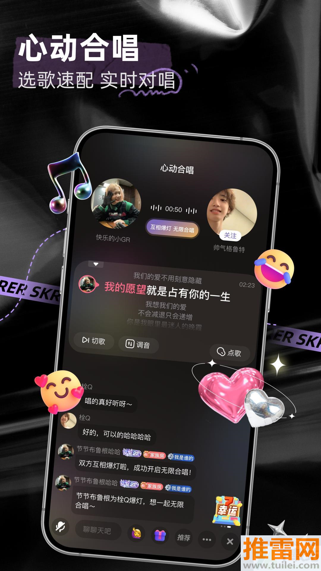 2、独创的语音弹幕功能让互动更有趣,唱到高潮时能实时收到其他用户的语音喝彩。