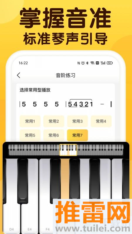 练习界面同步显示五线谱与简谱,搭配底部钢琴键盘实时发声,帮助用户更直观地理解音高关系。