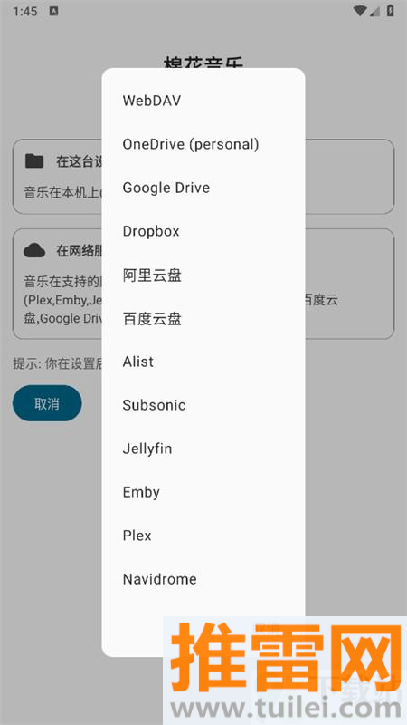 4、点加号之后可以选择不同的音源类型,比如本地文件夹、WebDAV、网盘或者媒体服务。