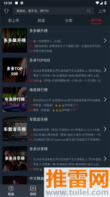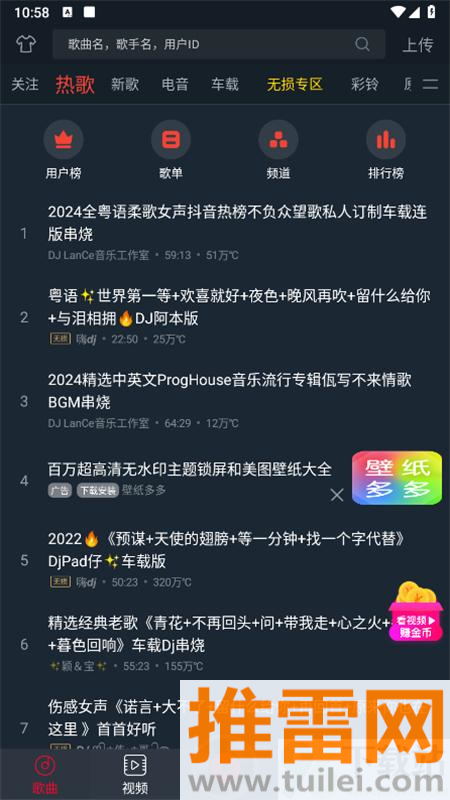 设有十二个细分音乐频道,包括热歌榜、无损专区、Remix专区、老歌改编、喊麦神曲等,风格齐全,切换随心。