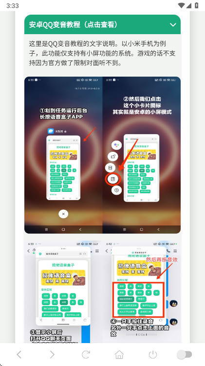 4、软件还提供详细的变声教程指南,通过图文说明演示悬浮窗开启方法:点击右下角开关按钮,加载完成后即可在其他应用中实时调用语音盒功能。