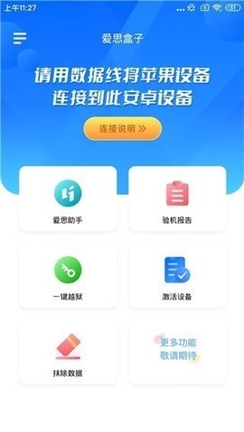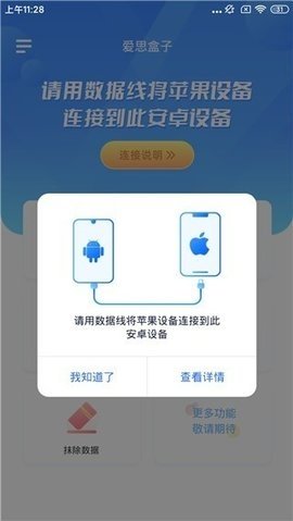 打开安卓手机上下载好的“爱思盒子”应用,准备好数据线并连接两部手机后: