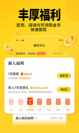 七猫中文网小说是一款电子书城在线阅读平台,拥有丰富多样的小说资源,并支持阅读赚钱,用户可以通过完成各种福利任务来赚取金币,而这些金币可以快速提现,享受到实实在在的收益。新用户还可以享受到丰厚的新人福利,每日签到也能快速获取大量金币,用户在阅读小说的同时还能赚取零花钱。