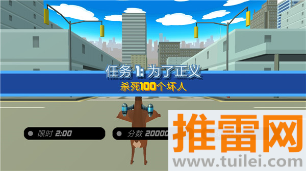 1、玩家操控一头装备武器的鹿在开放城市场景中自由行动,目标是清除指定数量的敌对黑衣人。