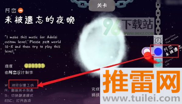 3、如图所示最后在自定义关卡界面点击【W键】浏览创意工坊歌曲,在右侧歌曲列表中即可找到中文歌。