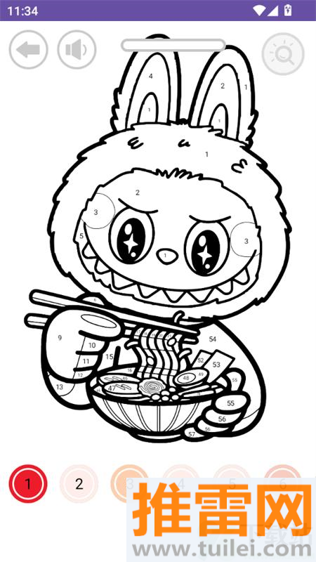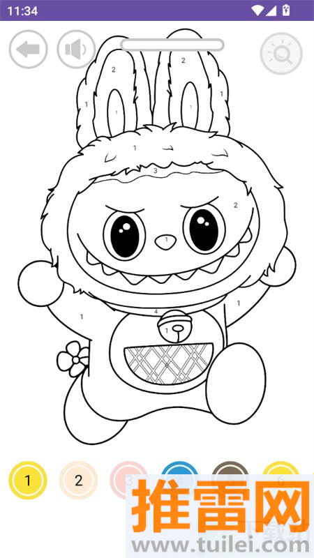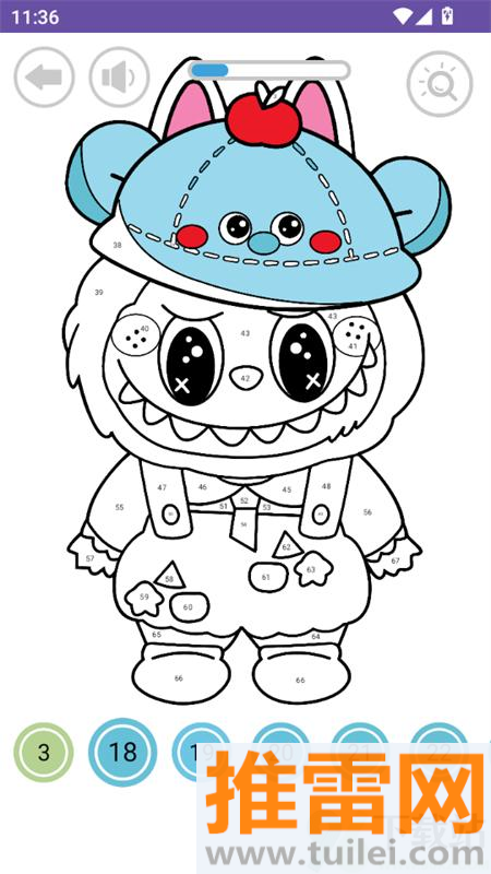 2、每张图都被分成一个个小区域,每个区域上标着数字,对应调色板上的颜色编号,点哪个数字就用哪个色,操作特别直接。