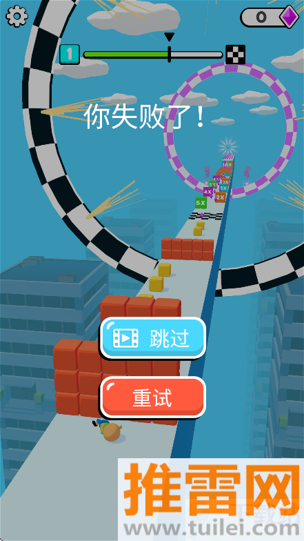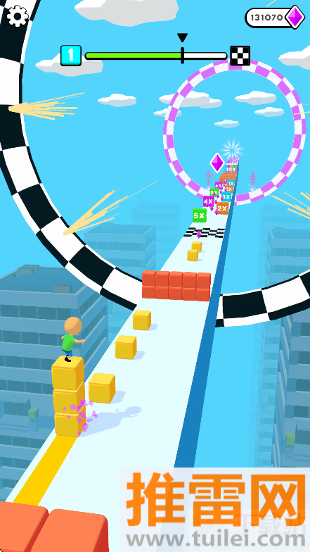 2、赛道里藏着不少可以利用的方块堆,跳上去就能把它们叠高,叠得比前面挡路的障碍还高,小人就能顺顺当当迈过去,这是过关的核心操作,也是游戏里最关键的策略点。