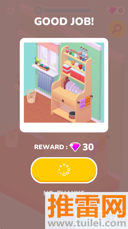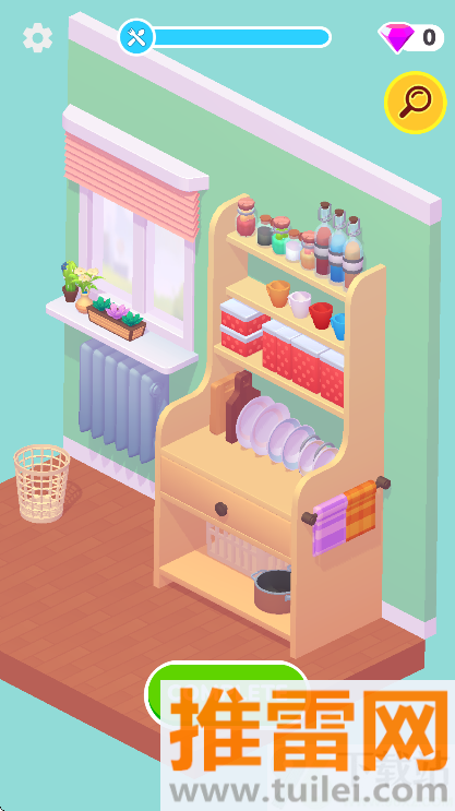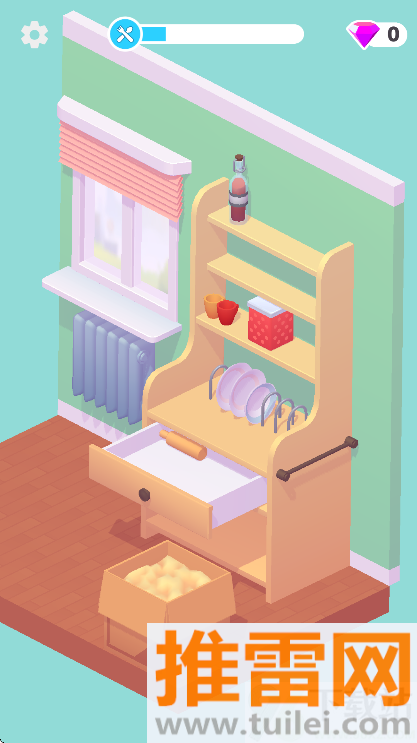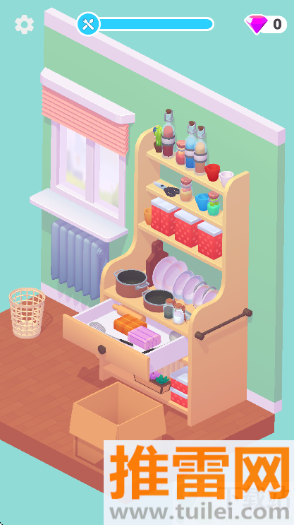 3、玩法简单得不能再简单,点一下、拖一下就行,但每个关卡的空间大小不一样,东西也越来越多,到了后来得想清楚怎么排布才不会显得乱,尤其是厨房和书桌这种地方,稍微没规划好就看着心烦。