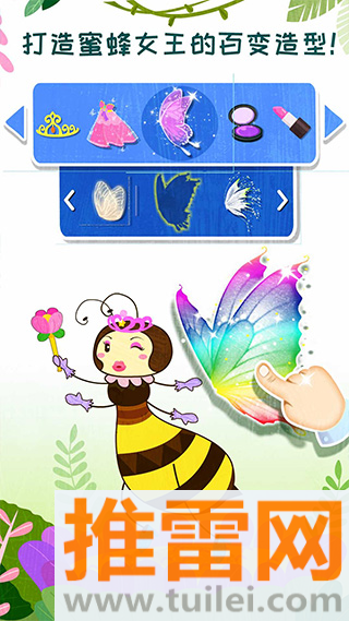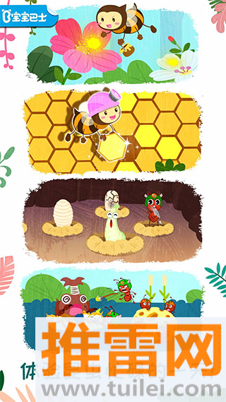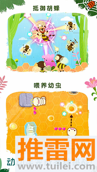 1、通过五大互动模块——装扮蜜蜂女王、幼虫养成、保卫蜂巢、运送粮食、昆虫认知,引导宝宝在情景中了解蜜蜂与蚂蚁的生活习性。