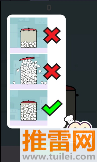 1、玩家需根据当前锅具的容量,精准投放玉米粒数量,确保爆米花膨胀后恰好顶起锅盖。