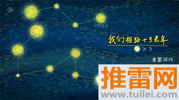 我们相距十万光年官方版就是让你在一片会呼吸的星空里,当一颗孤独又执着的流星,画面直接把梵高的《星夜》搬进了宇宙——漩涡状的云、金黄的弯月、巨大而闪烁的星星,全都像在低语,你操控的光球围着一颗星转圈蓄能,点一下就沿着切线飞出去,目标是撞上下一颗还在闪烁的星星,飞太慢,动力耗尽,飞太远,中途坠毁,犹豫太久,星星自己就消失了,整个过程安静得只剩钢琴声,没有敌人,没有倒计时,只有你和那颗十万光年外的星星之间的距离一点点缩短,玩着玩着,你会忘了这是游戏,更像是在宇宙里写一封慢递的情书。
