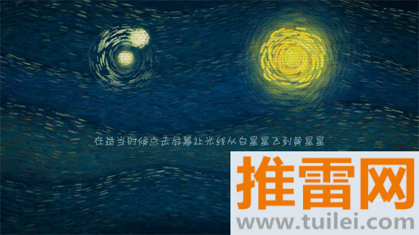 1、美术风格高度还原梵高《星夜》的笔触与色彩,星空充满流动感与情绪张力。