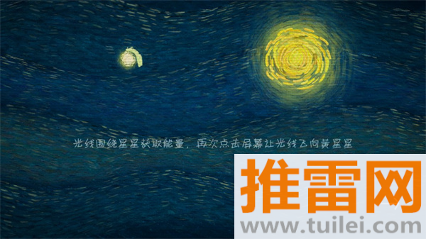 1、玩家操控一颗光球在动态星空中跳跃,通过触碰白色星星获取能量,再飞向黄色星星完成单次传递。