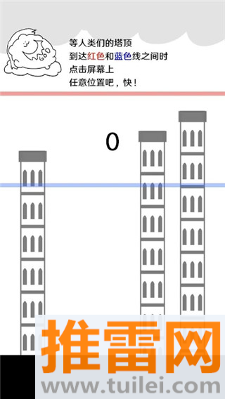 2、此后人类会持续建造新塔,塔顶上升过程中需在蓝红区间内点击触发落雷。