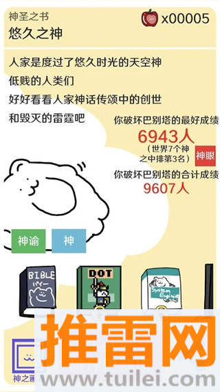 4、内置全球排行榜,玩家可与世界各地的“神明”比拼最高得分,激发反复挑战欲。
