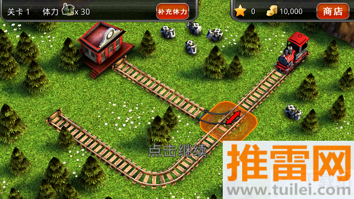 1、打开游戏后点“开始游戏”,直接进入第一个教学关,系统会引导你怎么切换轨道和查看火车行进方向。