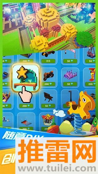 1、玩家从零开始打造属于自己的游乐园,通过摆放方块、铺设轨道、建造设施来吸引游客并扩大经营规模。