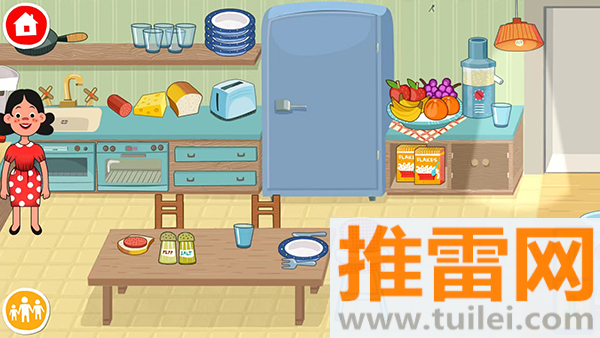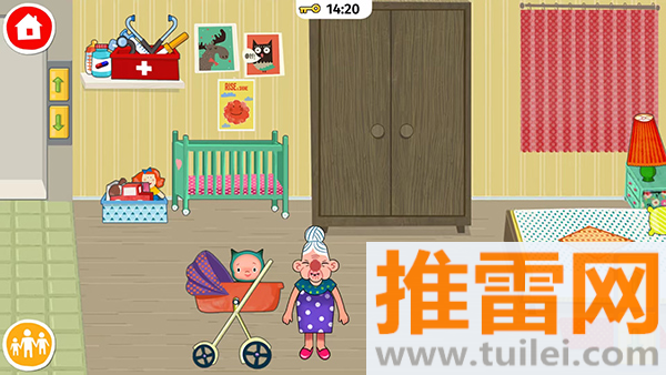 1、游戏以一栋三层家庭住宅为核心场景,每层设有不同功能区域,如厨房、卧室、车库和花园,供孩子自由探索。