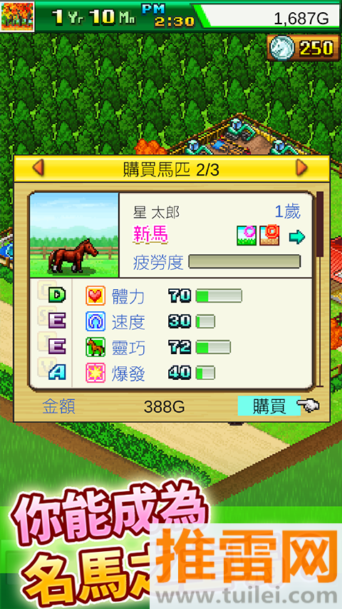 赛马牧场物语这游戏中是让你在一片像素风的草地上当个正经马场老板,你得买马、养马、训练马,还得给它们配种、雇骑手、建泳池和沙土场,忙得像个真·牧场主,马不是养大就行,得看血统、练属性、挑赛道,赢了比赛才有奖金,奖金多了才能扩建地盘、开冰淇淋店、吸引游客,最上头的是配种系统——两匹好马生出来的娃,说不定就是下一个三冠王,玩久了你会发现,这哪是养马,分明是在搞赛马界的“基因工程”,节奏慢,但越玩越有瘾,尤其看到自己一手带大的马冲过终点线那一刻,真有种自家孩子出息了的感觉。