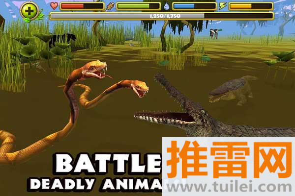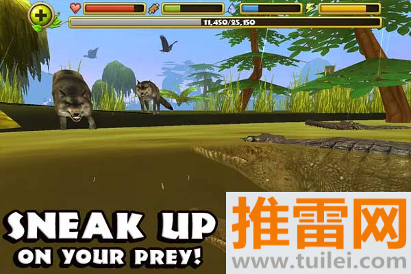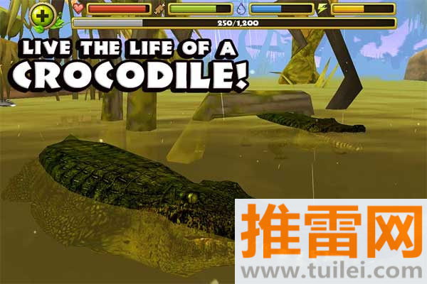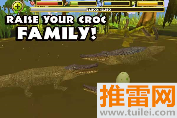 鳄鱼模拟器(Wildlife Simulator: Crocodile)这游戏是让你当一条又凶又累的野生鳄鱼,在热带雨林的沼泽里摸爬滚打——饿了得去咬鹿、追野猪,渴了得泡水,困了还得找个草堆睡觉,但别以为你是霸主就安全,鬣狗会偷袭你,猎豹从背后扑上来,连同类都可能趁你打盹直接下口,更刺激的是,你还能冲上岸袭击游客,不过人家手里有枪,一不小心反被爆头,养活自己还不够,还得找对象、生小鳄鱼,等它们长大还能帮你打架,整个地图超大,水陆都能跑,操作简单但节奏紧张,玩起来既野性又上头。