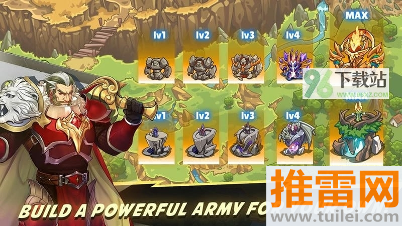 1、你可以建造并升级兵营、弓箭塔、魔法塔与魔像塔这四种基础防御工事,它们分别承担着阻挡、物理输出、魔法减益与范围打击的战略任务。