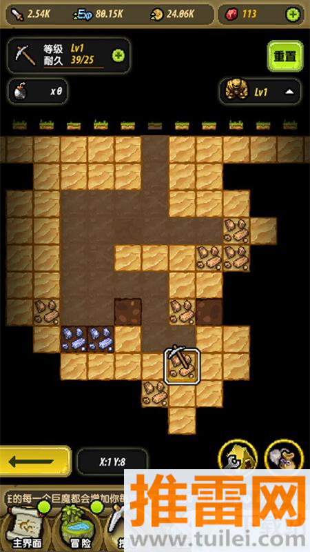 2、除了打怪升级,还有一个核心玩法就是挖矿,你在地图上点几下就能开挖,每次挖出来的资源都不一样,有可能出稀有矿石,也可能是啥都没有,全看运气,但挖得越多,高级物料出的几率也就越大。