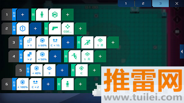 2、玩家需在程序编辑器中为机器人添加行为指令,如移动、攻击、条件判断、循环等。
