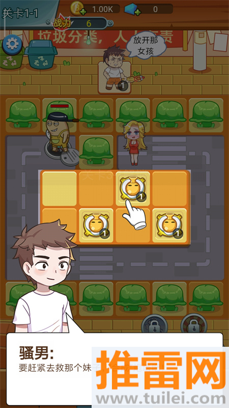 放开那女孩手机版这游戏一听就带着点“宅男幻想”的味道,但玩起来完全不油腻,反而又沙雕又上头,你扮演一个戴眼镜穿格子衫的普通宅男,走在街上突然看见女神被一群走路六亲不认、头发染得五颜六色的下水道混混围住,这时候你不能怂,得立刻掏出炮台安排上!游戏不是让你肉身冲上去,而是在地图空地上放炮塔,打跑流氓救女神,炮塔还能两两合成,两个一级小炮合成一个会喷火的二级大炮,再合下去甚至能出激光塔、电击塔,火力越来越猛,每关救下女神后还能约会一次,好感度涨了还能解锁新剧情,虽然女神偶尔翻白眼说“你谁啊”,但架不住你炮塔多啊,画风Q萌,混混动作浮夸,配上魔性台词,玩着玩着就忘了自己是在塔防,倒像是在演一出“技术宅的逆袭”。