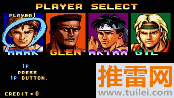 1、四个角色随便挑,马克、格伦、明、吉尔,长得不一样,出招也不同,但都靠腿吃饭。