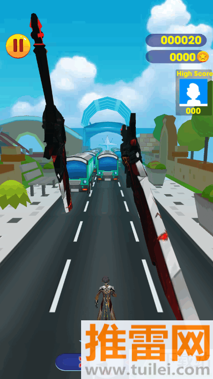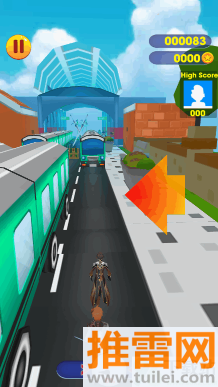 3、左右滑动控制角色在三条跑道之间切换,换道要果断,别拖,尤其是两边同时出障碍的时候,慢半拍就完了。