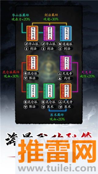 2、武功分属14大门派与10种职业,相同秘籍叠加可激活羁绊效果,满星后还能触发专属战斗特效。