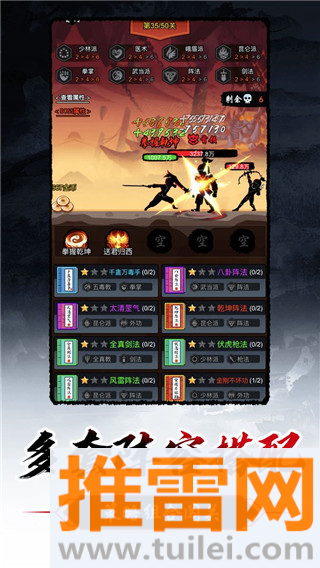 1、玩家通过自动战斗闯关,每击败一波敌人可从随机掉落的武功秘籍中选择其一,逐步构建专属阵容。