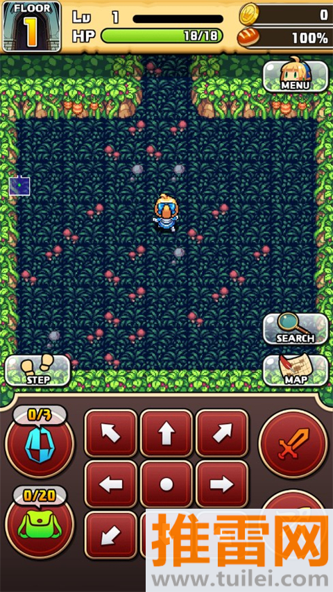 1、通过屏幕左侧8方向按键控制角色移动,每按一次移动一格,支持斜向行走。