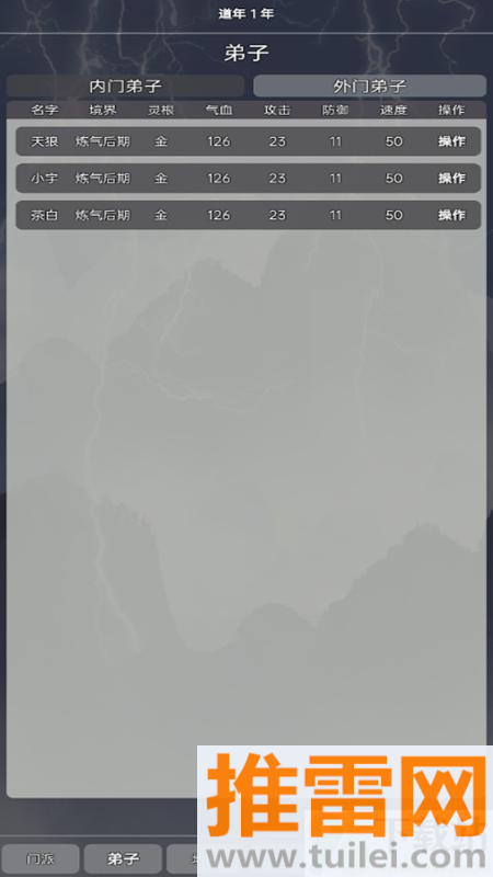 2、门派运行靠弟子撑着,初期只能靠两个元老带节奏,后期可以收徒、招人,甚至抢别人的徒弟,只要修为够硬,人多了自然不怕惹事。