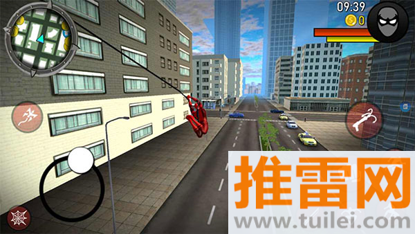 4、长按蛛丝键可瞄准方向发射,松手后角色会飞荡至目标点,途中可再次点击攻击键发动空中打击。
