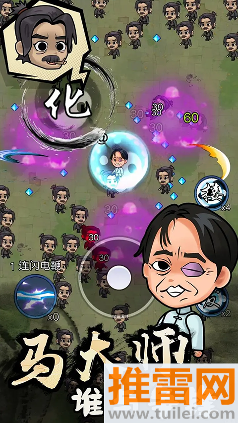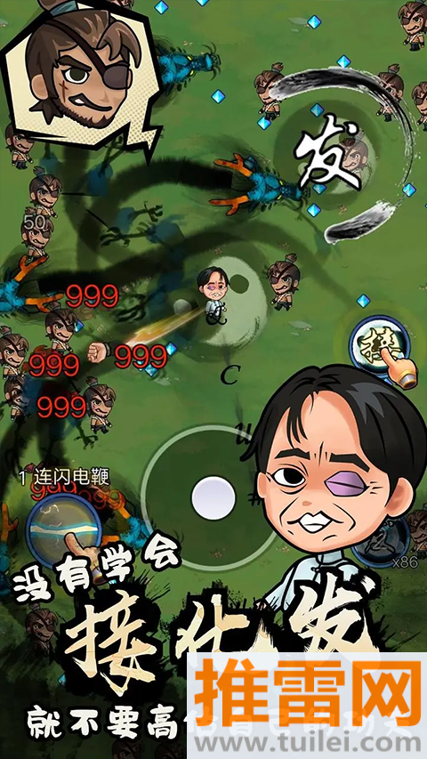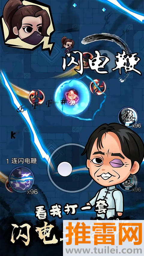 2、每次升级都能从三个武功里选一个,你可以自由搭配,是选择“五连鞭”全屏攻击,还是“接化发”近身防守,组合出你自己的独门套路。