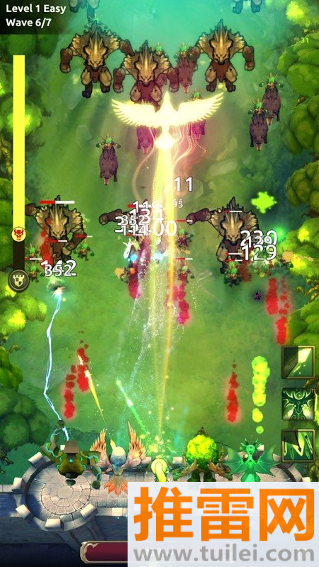 1、进入游戏后角色自动攻击当前关卡的怪物,屏幕下方显示技能冷却状态。