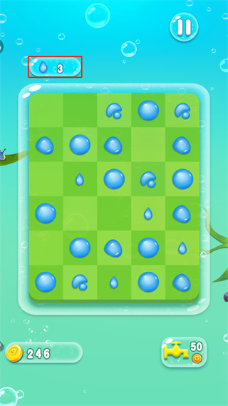 3、游戏上方的水滴数量,玩家需要在水滴消耗完前将关卡中的水滴都弄爆;