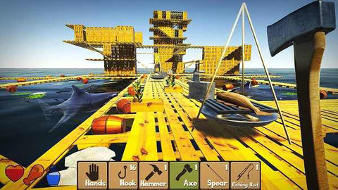 在木筏上搭建地板、墙壁、屋顶,逐步扩展生存空间,打造安全庇护所。