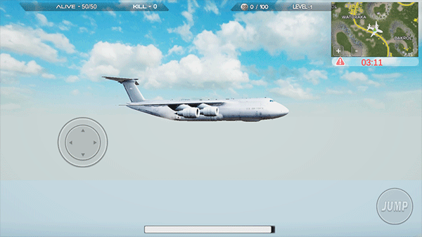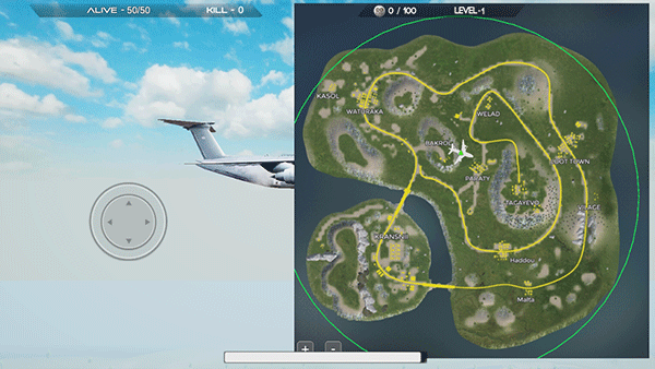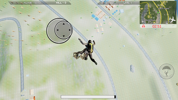 4、通过右上角的小地图选择初始降落地点,跳伞时前推虚拟摇杆可加速至234km/h,尽早落地抢占先机,若将视角拉平则可保持125km/h速度飞向更远落点。