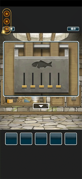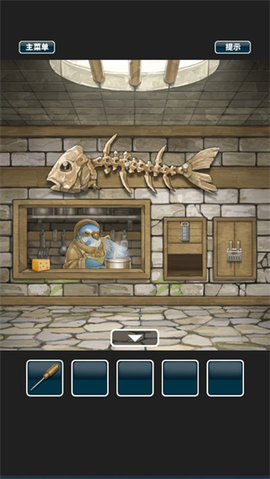 3、可以看到最右面有个柜子,根据最上面的鱼骨的上下位置,打开柜子,得到一个钓鱼竿。