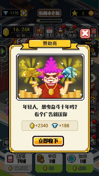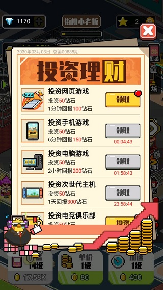 首先,整体游戏的升级选项非常的多,普通升级一共有三种,第一种是玩家通过升级场景中的电玩机的数量。第二种则是玩家需要升级电玩机每次使用时的单价,第三种则是玩家升级电玩机每次使用的时间,不过第三个我不太推荐强制升级,这个升级作用不是很大,玩家只需要点击屏幕加快当前的时间就可以结束这个问题。然后科金升级主要是潮牛的各种装饰,这个需要玩家用钻石来买,不过这个钻石他通过看广告场景,各种各样的广告掉落以及一些任务。剧情都可以直接进行获得,而且你可以通过投资钻石来进行利滚利。这个形成循环其实问题不大,所以说对玩家来说,钻石和金币相比而言也就是稍微拿获得的一个货币而已。