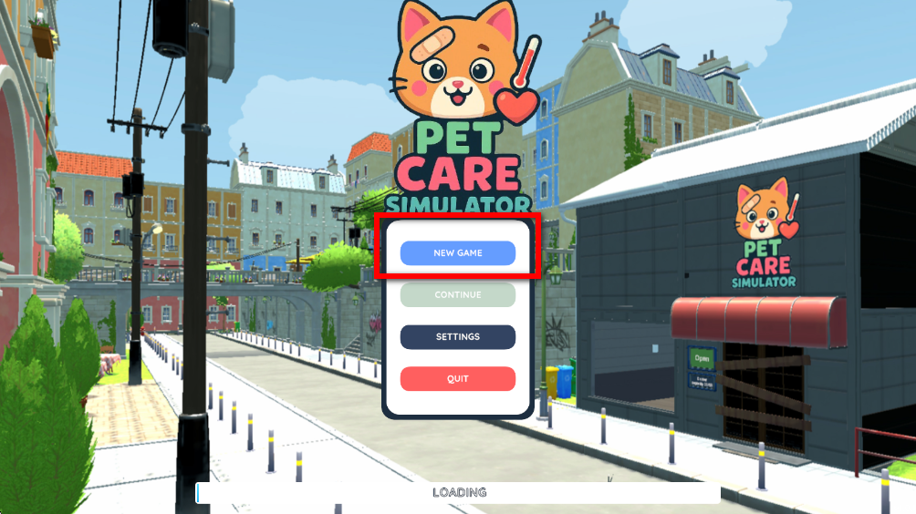 1、启动游戏后点击NEW GAME按钮创建新存档,系统会引导您完成初始设置,包括选择宠物店名称和外观风格。
