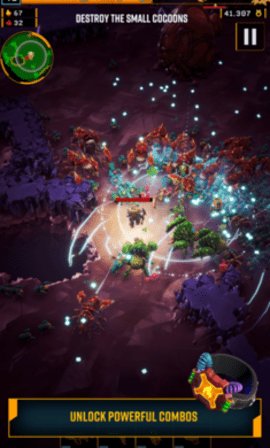 5、游戏采用自动射击,玩家消灭异虫会获取经验,每次升级可选择一项强化;
