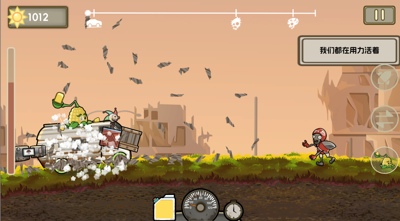 控制战车在道路上行驶,通过撞击或植物攻击消灭僵尸,尽可能行驶更远距离。